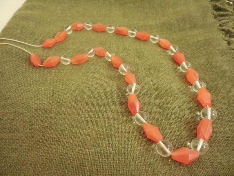 Ожерелье собрано из двух наиболее характерных для вятичей типов бусин - бипирамидальных сердоликовых и круглых хрустальных. Бусины нанизаны на шнурок, сплетенный из шерстяных нитей. Ожерелье состоит из 37 бусин. Такое количество бусин, хотя и говорит о зажиточности владелицы ожерелья, вполне обычно для вятичей, ожерелья которых состояли из большего числа бусин, чем ожерелья более южных и западных племен Древней Руси. И бипирамидальные сердоликовые, и круглые хрустальные бусины в точности соответствуют археологическим находкам.