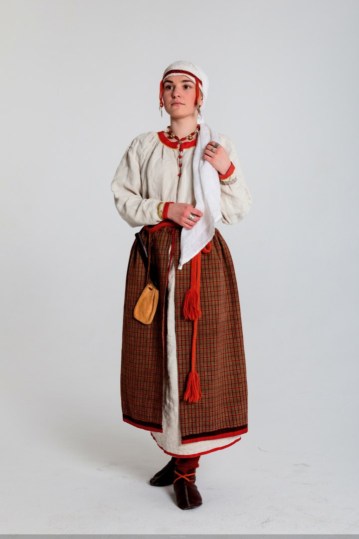 Понева - распашная юбка, обычно клетчатая или полосатая, состоящая из трех сшитых или несшитых полотнищ, собранных на поясе, с разрезом спереди. Позже поневы стали глухими, добавилось еще одно узкое полотнище - прошва. Но наиболее архаичная форма - клетчатая понева из трех полотнищ. Скорее всего, она и присутствовала в костюме женщины XI-XII веков.